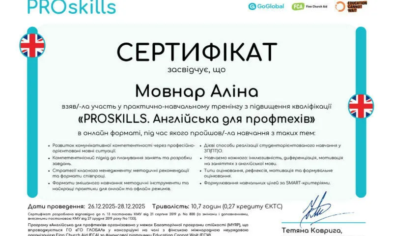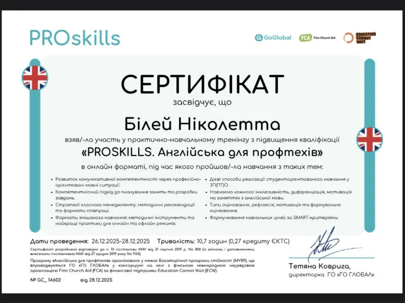 12.01.2026Викладачі іноземної мови КЗ «Тячівський професійний ліцей» ЗОР Аліна Мовнар та Ніколетта Білей у грудні 2025 року взяли участь у навчально-практичному тренінгу з підвищення кваліфікації «PROSKILLS. Англійська для профтехів», який проводився за підтримки ГО «GoGlobal» у співпраці з міжнародними партнерами та відбувався в онлайн-форматі з 26 по 28 грудня 2025 року.
