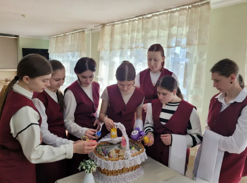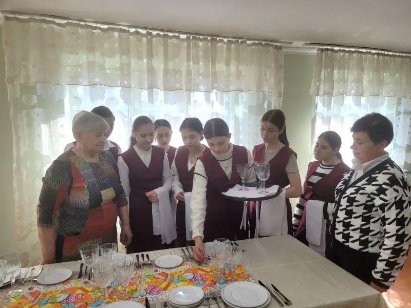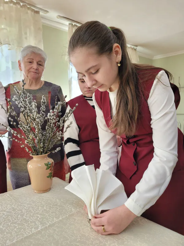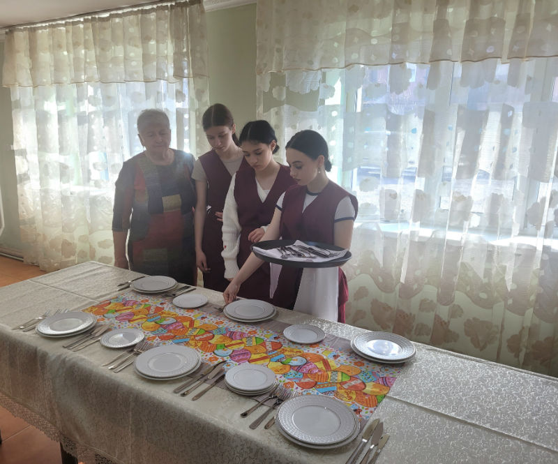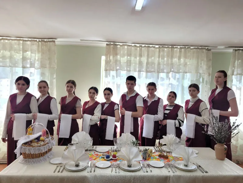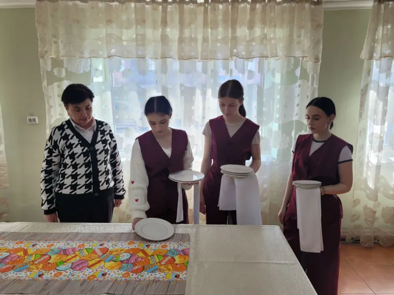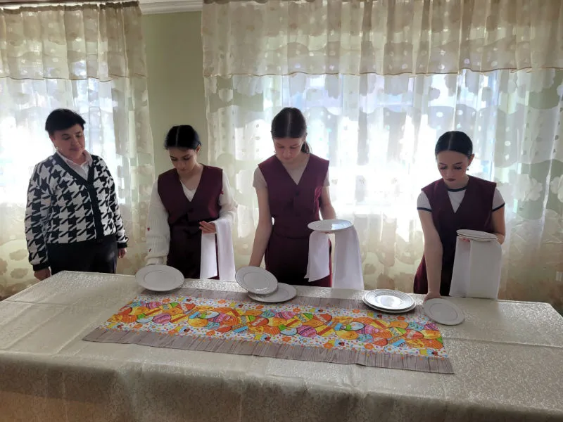 Під час роботи було повторено правила святкового сервірування, розглянуто правильне розміщення посуду та столових приборів, а також поєднання елементів великоднього декору. Здобувачі освіти долучалися до оформлення столу, підбору декоративних елементів та створення святкової композиції.