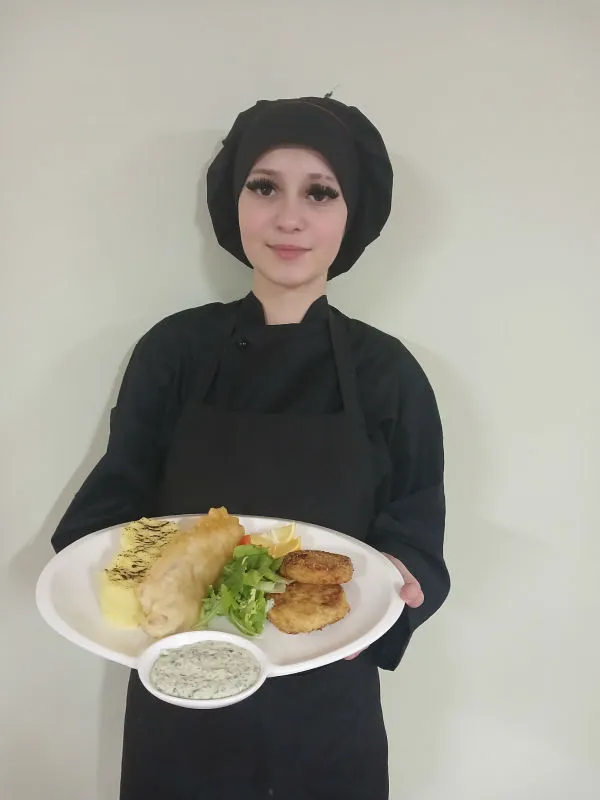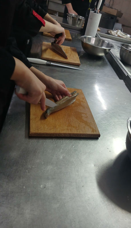 Під час уроку навчальна кухня перетворилася на справжню творчу майстерню: здобувачі освіти зосереджено працювали з продуктами, вчилися правильно обробляти рибу, добирати інгредієнти, дотримуватися технології приготування та естетично оформляти страви. Кожен етап роботи був важливим – від підготовки сировини до фінальної подачі.