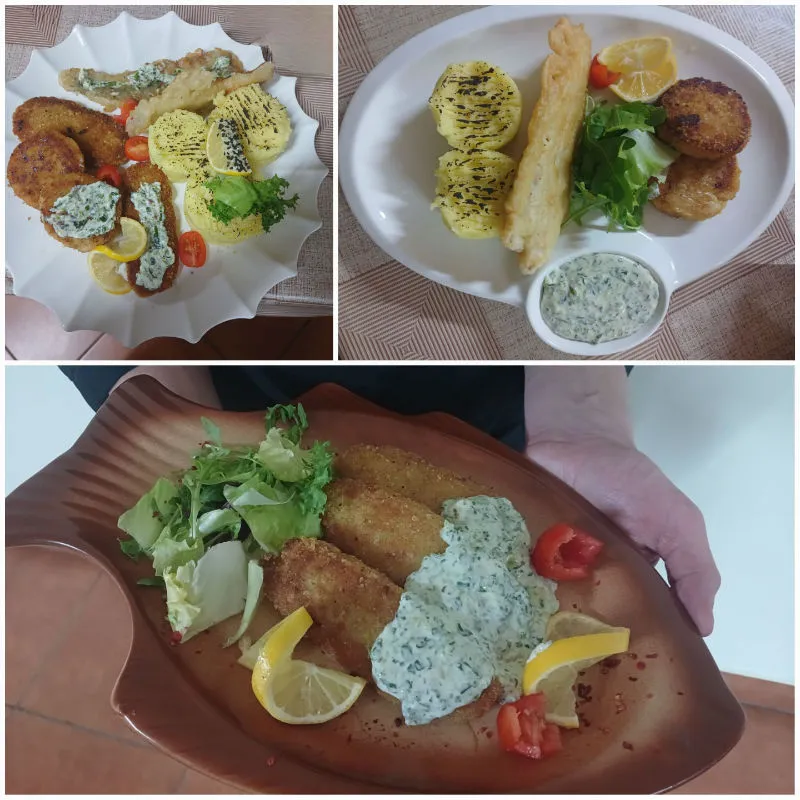 - рибу, смажену в клярі, із запеченим картопляним пюре.