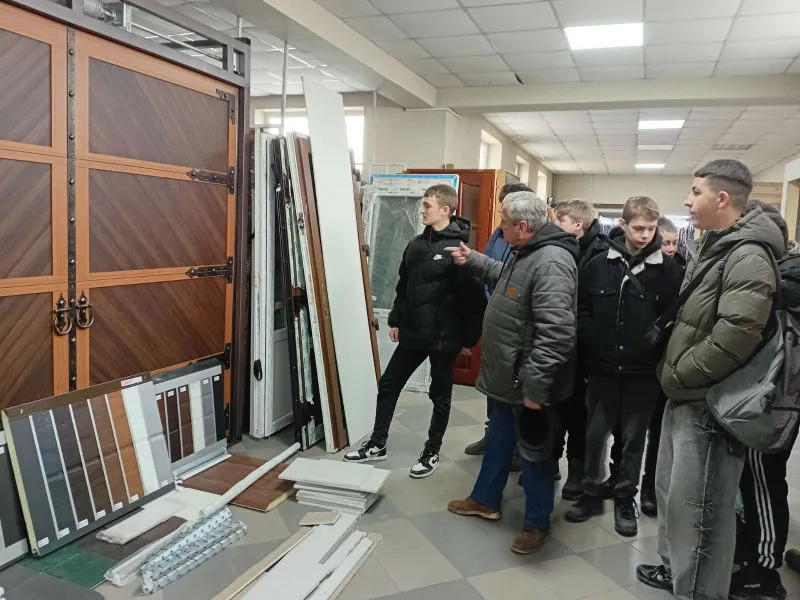 Після теоретичної частини відбулася міні-екскурсія до магазину «СТИЛЬ». Здобувачів освіти вразив широкий асортимент дверей як важливого елемента оформлення інтер’єру. Майстер виробничого навчання Іван Томишинець звернув увагу на матеріали, особливості монтажу та експлуатації.