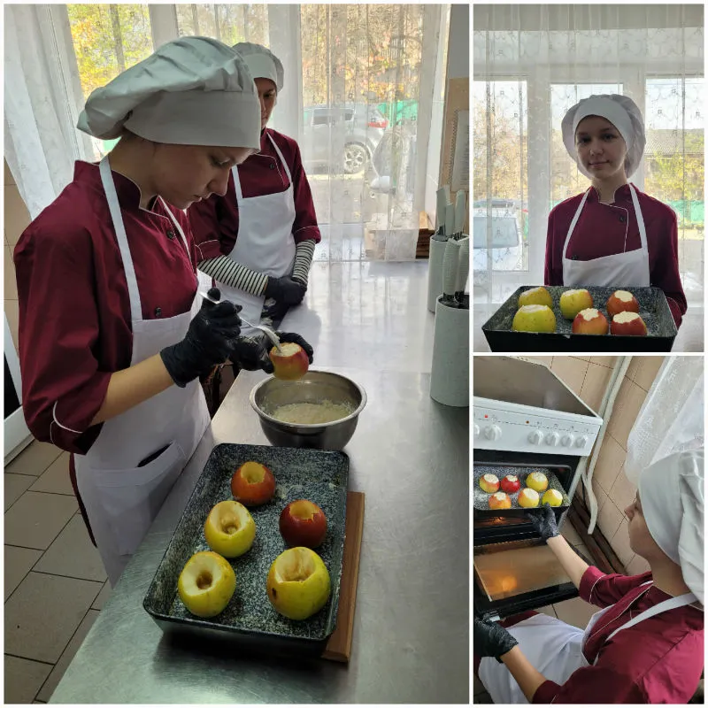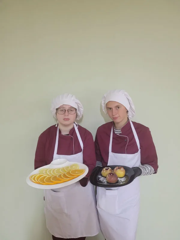 Здобувачі професійної освіти 2 курсу КЗ «Тячівський професійний ліцей» ЗОР за професією кухар, офіціант (майстер виробничого навчання Катерина Лигирда) на уроці виробничого навчання готували запечені яблука, фаршировані кисломолочним сиром. Приготували також крем муслін – це заварний крем, збитий із вершковим маслом. Десерт подавався в креманках, що дозволило попрактикуватися ще й у оформленні.