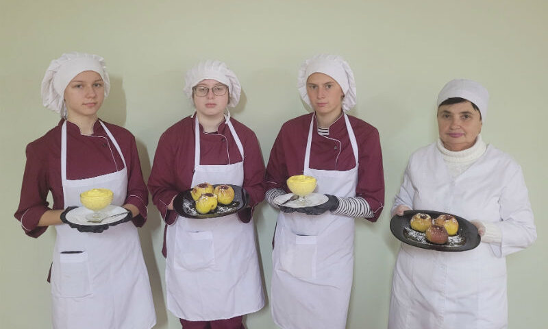 Здобувачі професійної освіти 2 курсу КЗ «Тячівський професійний ліцей» ЗОР за професією кухар, офіціант (майстер виробничого навчання Катерина Лигирда) на уроці виробничого навчання готували запечені яблука, фаршировані кисломолочним сиром. Приготували також крем муслін – це заварний крем, збитий із вершковим маслом. Десерт подавався в креманках, що дозволило попрактикуватися ще й у оформленні.