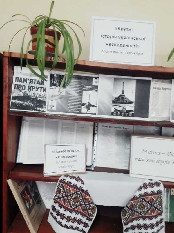 У бібліотеці оформлено тематичну виставку «Крути: історія української нескореності», на якій представлено документи та історичні матеріали про події січня 1918 року.