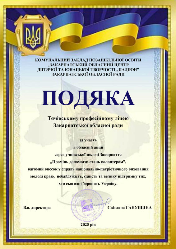 За участь в обласній акції «Промінь допомоги – стань волонтером» здобувачі освіти КЗ «Тячівський ПЛ» ЗОР нагороджені подякою.
